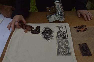 creazione del telaio, stampa serigrafica e linocut per personalizzare supporti di recupero a cui donare nuova vita.