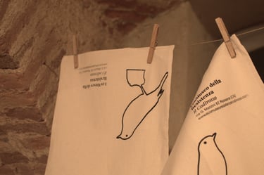Prodotti simili (borse di tela e taccuini) sono disponibili in museo a pagamento e su offerta libera.